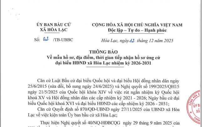Ủy ban bầu cử xã Hòa Lạc thông báo mẫu hồ sơ, địa điểm, thời gian tiếp nhận hồ sơ ứng cử đại biểu Hội đồng nhân dân xã Hòa Lạc, nhiệm kỳ 2026-2031 như sau: