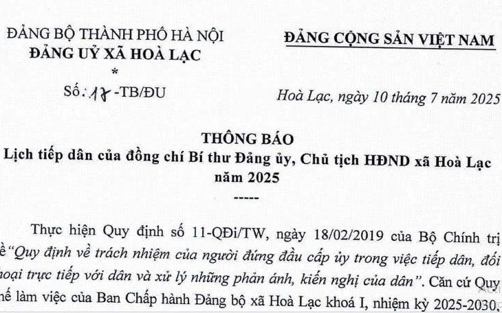 plus-circle Created with Sketch Beta. Aa UBND xã Hòa Lạc thông báo về Lịch tiếp công dân của đồng chí Bí thư Đảng ủy, Chủ tịch HĐND xã năm 2025! 11:21 14/07/2025 UBND xã Hòa Lạc thông báo về Lịch tiếp công dân của đồng chí Bí thư Đảng ủy, Chủ tịch HĐND xã năm 2025! Xem chi tiết Thông báo số 17-TB/ĐU ngày 10/7/2025 của Đảng ủy xã Hòa Lạc tại đây!